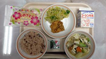 今日の給食は、赤飯、鶏の唐揚げ、菜の花の辛子和え、豚汁、お祝いクレープ、牛乳です。