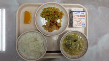 今日の給食は、ご飯、鶏肉のスタミナ焼き、ニンジンとジャガイモのきんぴら、味噌汁、清美オレンジ、牛乳です。