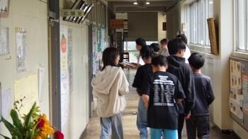 掲示委員会は、廊下に貼ってある古い掲示物をはがし、新しいものに交換していました。