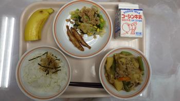 今日の給食は、ご飯、じゃこふりかけ、肉じゃが、ワカサギのからあげ、ツナとわかめのサラダ、バナナ、牛乳です。
