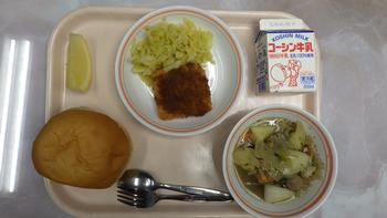 今日の給食は、セルフフィッシュバーガー、ポトフ、グレープフルーツ、牛乳です。