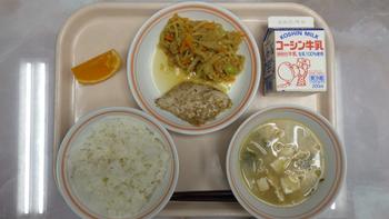 今日の給食は、ご飯、サバのごま味噌焼き、切り干し大根とツナのカレー炒め、味噌汁、清美オレンジ、牛乳です。