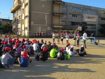 | 一番乗りは6:30ごろ。天候にも恵まれ、子どもたちは元気に登校してきました。担任の先生が一人一人健康観察をし、順々に並んでいきました。5年生の動きは、朝からとてもスムーズです。 |