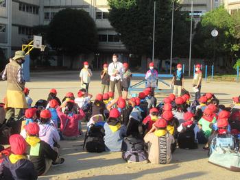 | 予定通りの時間に出発の会を始めました。皆さんしっかりお話を聞くことができています。さすが高学年です。「しっかりしおりを見る」「協力して行動する」などのめあてを確認し、林間学園への気持ちを高めていました。出発の前に、見送りに来てくださったたくさんの保護者の皆様に「いってきます」のごあいさつをしました。 |