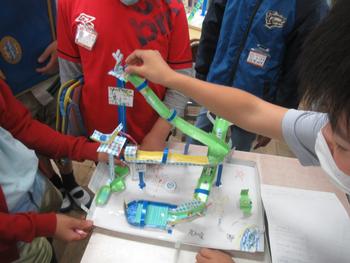 | 校長室の前にメダカのたまごが現れました。校長先生が自宅で飼育しているメダカのたまごだそうです。観察しやすいので来校した際は、是非ご覧ください。 | 3年生が理科でゴムの働きの学習に取り組んでいました。ゴムの力で動く車で遊びながら意欲的に学んでいました。 |