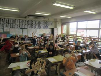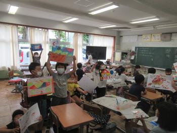 | 1年生がLATの先生と外国語について学んでいました。 | 4年生が作品を完成させて、お互いに鑑賞をしていました。どれも工夫たっぷりの作品で素敵だったので写真でとらせてもらいました。 |