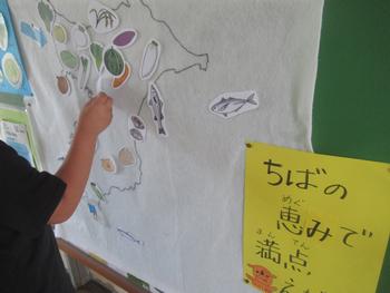 | 6年生の国語授業風景。「川とノリオ」の学習でした。さすが6年生。高度な読みで作品に接しています。 | 栄養士の先生が千葉の特産品が一目でわかる掲示物を作っていました。子どもたちは触れながら、千葉の特産品について学んでいます。 |