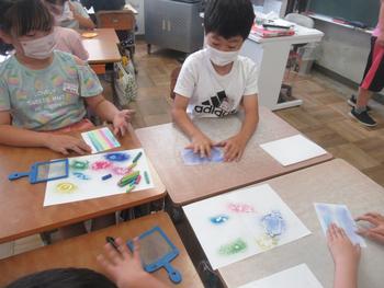 | 2年生が図工で作っている作品を見せてくれました。小さい紙に絵を描き、つなげて世界を広げていきます。思い思いのイメージで、一人ひとりバリエーションがあってとても楽しいです。 |