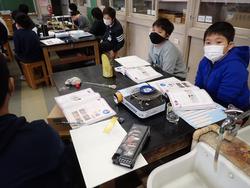 | 1年生の国語授業風景。動物の写真に吹き出しをつけて、それをもとに物語を考えるそうです。一生懸命考えています。 | 理科「水溶液の性質」の学習に取り組む5年生。水に溶けた物質は一体どこに行ったのかを実験で明らかにしていました。 |