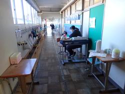 | 3年生が書き初め練習を体育館で行いました。文字のバランス、名前を書く位置などについて確認しました。かなり上達しました。 | 1年生がキリンの絵を掲示していました。大きく思い思いに描いたキリンがなんとも愛らしいです。そして上手です。 |