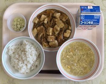 献立:ご飯 マーボー豆腐 スーミータン うぐいすきな粉まめ 牛乳