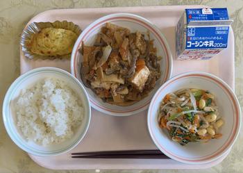 献立:ご飯 ジャージャン豆腐 野菜と大豆のナムル スイートポテト 牛乳
