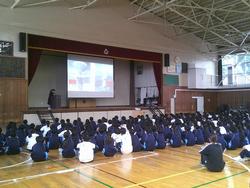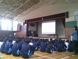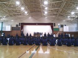 昨日の集会では、部活動などの表彰と長崎平和大使の訪問報告、英語スピーチ大会の出場者による発表が行われました。