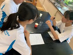 1年生の理科の実験では、白い粉末が何なのかを調べていました。加熱すると燃えるのか、水に溶けたら透明になるのかなど、いくつかの方法で変化を確認しました。班で協力して、正しい実験方法で行えていました。