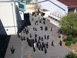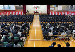本日、令和8年度入学式が行われました。昇降口でのクラス発表名簿の前では、新入生が新しいクラスを見て、期待に胸を膨らませている様子でした。入学式の呼名では、緊張しつつも決意のこもった返事をしていました。在校生代表として参列していた二年生も、新入生に先輩としての立派な姿を見せていました。
