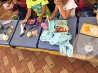 11時20分まで遊んで、イベントホールに帰ってきました。確保してある席のところに集合。みんな、レジャーシートを敷いて、席をテーブルに見立て、さあ、お弁当タイム。ものすごく遊んだので、お腹もすいたー。すごく嬉しそうにお弁当を広げています。食べ終わって、おやつタイムを楽しんでいた頃、突然すごい雨。外で食べていた学校が急いで移動してきました。風はないので、イベントホールの中は、全く問題ありません。