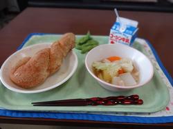 今日の給食は週1回のパンの日です。でも、今日のパンは大人気のきなこ揚げパンです。手や口の周りにきなこを一杯つけて食べていました。