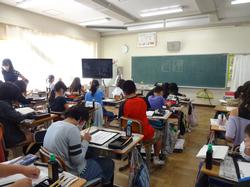 校舎を回っていたら、どこからか墨の臭いがします。習字の授業かな?と思って教室内に入ったところ、小筆で俳句を清書していることろでした。担任の先生が筆で書いてみよう。と思いついたとのことでした。習字の授業後、道具をそのまま残して、一枚の紙に俳句をしたためていました。墨が乾いたら絵を書き入れ、更に秋の雰囲気を出します。みんな、書き慣れない小筆で一生懸命、真剣に書いていました。