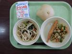 河小の今日の給食は 五目うどん ししゃもフライ 茎わかめのサラダ さつまいも蒸しパン 牛乳 でした。
