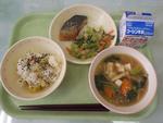 <今日の給食>さつまいもごはん さばのソース焼き 小松菜のナムル ごま味噌けんちん汁 牛乳