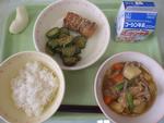 <今日の給食> ごはん 生揚げの肉巻き ピリ辛きゅうり じゃがいものそぼろ煮 梨 牛乳