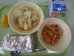 <今日の給食>ハムとチーズのホイルパン ぶたと野菜のスープ煮 マカロニ炒め オレンジ 牛乳