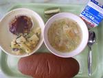 <今日の給食> 黒パン カップミートローフ ジャーマンポテト リボンマカロニスープ キウイフルーツ 牛乳