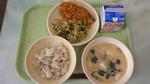 <今日の給食> 菜飯 あじのコーンフレーク揚げ かんぴょうの胡麻酢和え まめまめ汁 牛乳