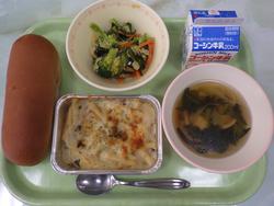 <今日の給食> 黒パン さつまいものグラタン 海藻サラダ きのことコーンのスープ 牛乳