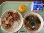 <今日の給食>ジャージャン豆腐丼 手作り肉団子スープ みかん 牛乳