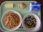 <今日の給食> スパゲッティボロネーゼ ひじきとひよこ豆のサラダ チーズスコーン パインアップル 牛乳