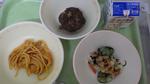 <今日の給食> スパゲッティボロネーゼ ひじきサラダ とうふドーナッツ 牛乳 (見本ケース給食を撮影)