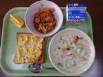 <今日の給食> エッグトースト 白菜の和風シチュー マカロニ炒め オレンジ 牛乳