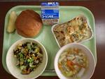 <今日の給食> 胚芽パン ポテトグラタン ひじきとひよこ豆のサラダ 白菜とコーンのスープ りんご 牛乳