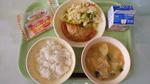 <今日の給食> ごはん 手づくり揚げ餃子 ぱりぱりサラダ 胡麻辛具だくさんみそ汁 みかんクレープ 牛乳