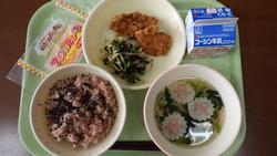 <今日の給食>赤飯 鶏肉のから揚げ 海苔酢和え すまし汁 みかんクレープ 牛乳