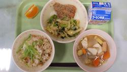 <今日の給食>大豆いりツナごはん とりにくのごま味噌やき なのはなのからし和え さつま汁 きよみオレンジ 牛乳