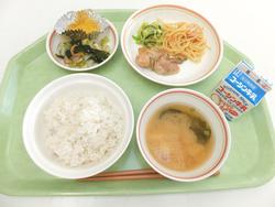 チリビーンズスパゲティ(レンズ豆) 切干大根サラダ たまごスープ きなこビーナツ 牛乳 |