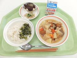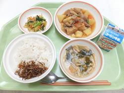 ごはん とりの南部焼き ごぼうの揚げ煮 小松菜とさつまあげのソテー 味噌汁 ヨーグルト 牛乳 |