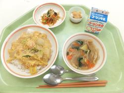 親子丼 わかさぎフリッター きゅうりのピリ辛和え 味噌汁 パイナップルケーキ 牛乳 |