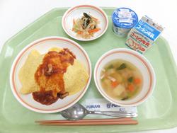 オムライス いりこと大豆の揚げ煮 パリパリサラダ きゃべつとベーコンのスープ はちみつレモンゼリー 牛乳 |