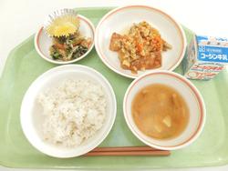ごはん 豚肉と厚揚げの味噌煮(豆板醤) 梅肉和え かき玉汁 みかん(缶詰) 牛乳 |