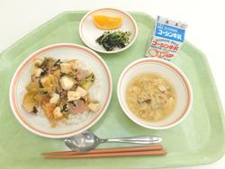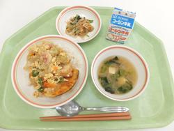 かきたま丼(こうや豆腐入り) ごぼうサラダ 味噌汁 にんじんのアーモンドマフィン 牛乳 |