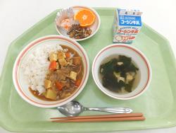 和風ポークカレー いりこと大豆の揚げ煮 なます 七草スープ みかん 牛乳 |