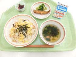 ちらし寿司 いわしフライ(大豆フレーク) ブロッコリー すまし汁 白玉あずき 牛乳 |