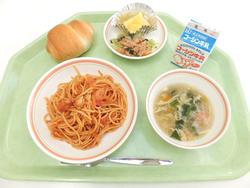 トマトとあさりのスパゲティー テーブルロール ツナサラダ 卵スープ パイナップル 牛乳 |