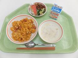 ジャンバラヤ ししゃもフリッター 海藻サラダ 卵スープ(トマト) ミカン(缶詰め) 牛乳 |