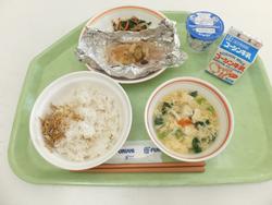 ごはん さごしの西京焼き 梅肉和え 茎わかめきんぴら かきたま汁 もちもち豆腐ドーナッツ(ごま・きなこ) 牛乳 |