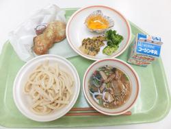 かきたまうどん わかさぎフリッター こうや豆腐の揚げ煮 みかん 牛乳 |