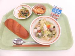 コッペパン いちごジャム クラムチャウダー(あさり・かぶ入り) わかめサラダ ナタデココ&りんご 牛乳 |